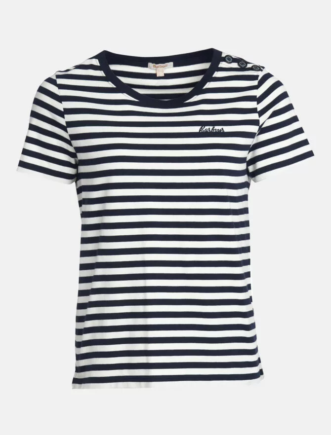 Il Barbour Ferryside Top vanta una striscia di ispirazione nautica con un bordo del collo a contrasto e bottoni in finto corno sulla spalla sinistra. Realizzato in 100% cotone, questo top è rifinito con una scritta Barbour ricamata a sinistra del petto per il perfetto abbigliamento quotidiano.