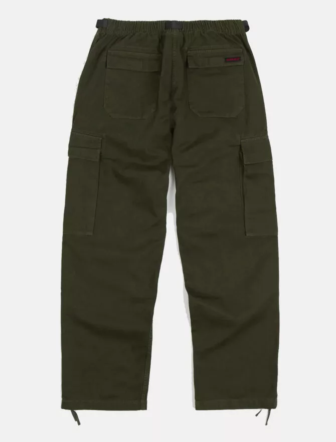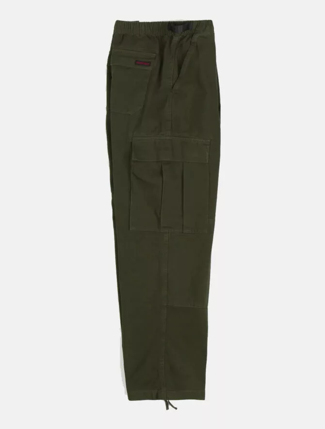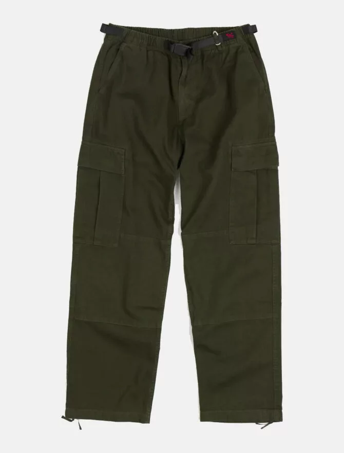 Pantaloni cargo Gramicci in verde intenso. Ispirati ai classici stili di arrampicata su roccia, questi pantaloni Gramicci a gamba affusolata sono realizzati in twill di cotone biologico con una struttura in tessuto elasticizzato e una vestibilità regolare. Caratterizzati da un elastico in vita intrecciato, una cintura in tessuto integrata e un cavallo a soffietto dalla linea pulita, questi pantaloni cargo verdi presentano anche pannelli rinforzati sulle ginocchia e orli regolabili.