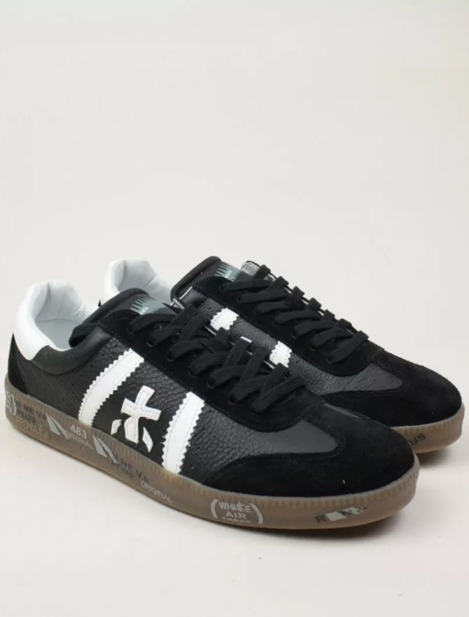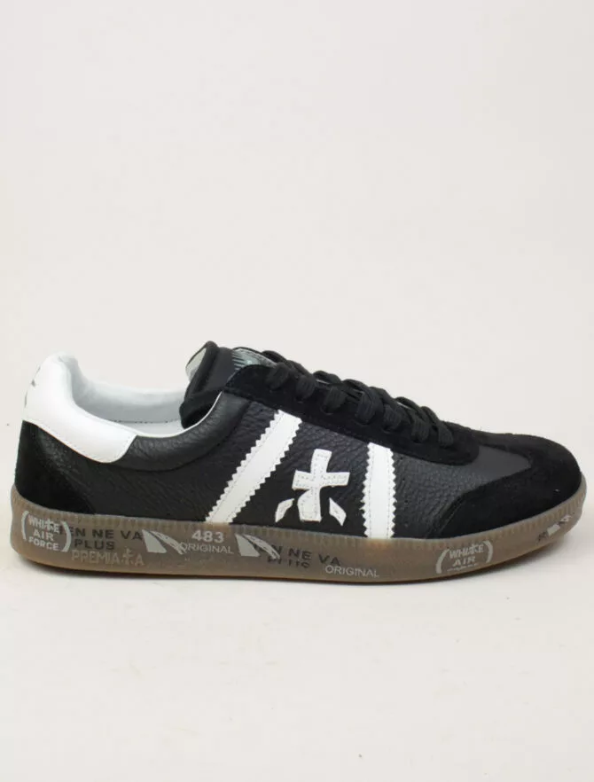 Sneakers Premiata modello ‘Bonnie’ in morbida pelle nera e suede. Il look è arricchito dall’inconfondibile istrice sulla linguetta e topponcino e logo Premiata bianco a contrasto. La suola in gomma a cassetta, completa un look grintoso e adattabile a tutti i giorni.