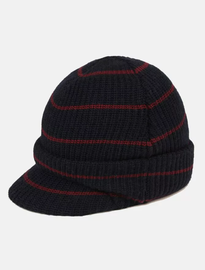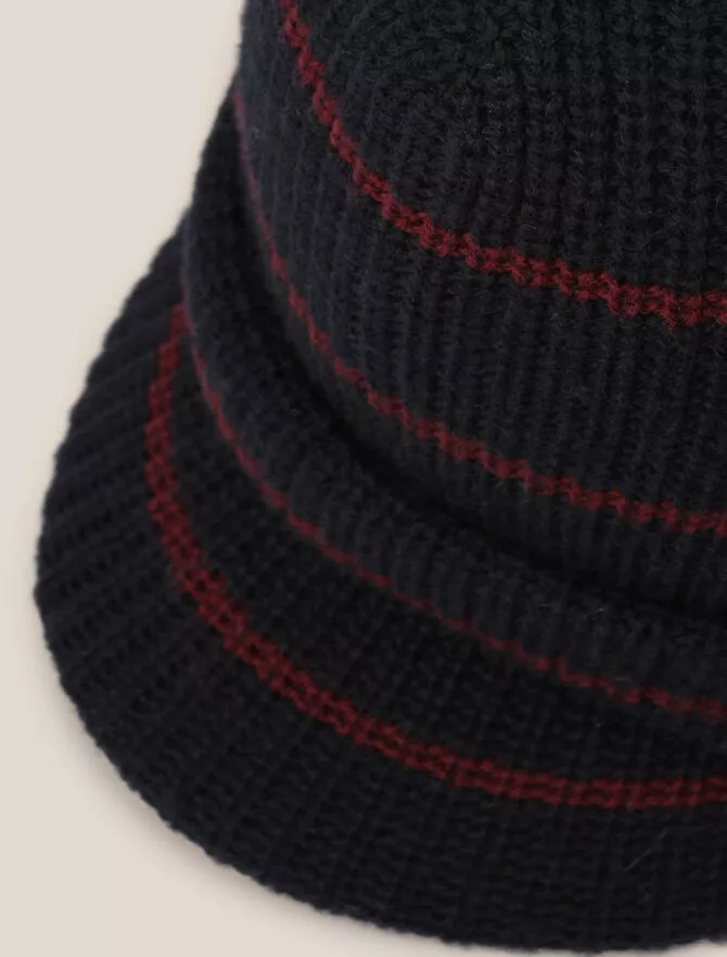 Combinazione ibrida di un cappello lavorato a maglia e un berretto tradizionale. Realizzata in lana merino, caratterizzata da dettaglio visiera dello stesso tessuto e sottili righe orizzontali.